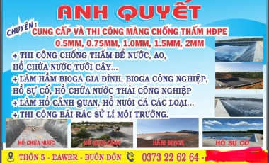 Màng Chống Thấm HDPE Anh Quyết tự hào là đơn vị chuyên cung cấp và thi công chống thấm bằng màng HDPE tại Đăk Lăk với nhiều năm kinh nghiệm thực tế.